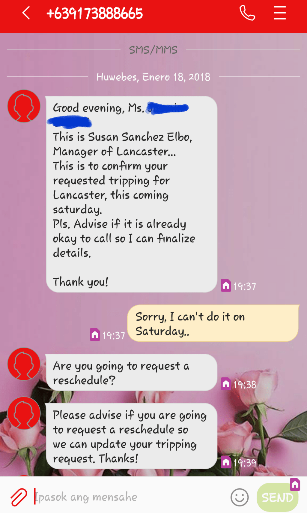 The sender said that she was the manager of Lancaster and asked me if she could call. I responded to the sender saying I could not make it on Saturday. I had reservation, though because I was still considering meeting her some other days. The first three messages came in fine, but it gave me a weird feeling. The feeling was confirmed by the fourth message.